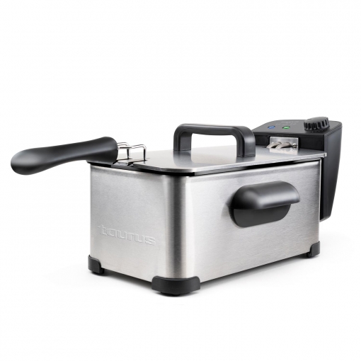 Seguimos con esta freidora Taurus Fry DF2020 de 2000 vatios de potencia. La freidora funciona a una temperatura de entre 150 a 199 grados, totalmente regulable. Asimismo, tiene una capacidad de tres litros, la cual te permite hacer hasta un kilo de patatas fritas en una sola sentada.