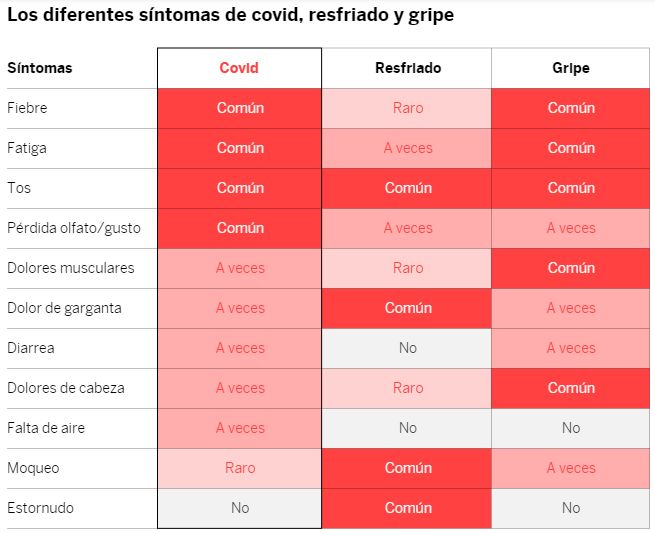 En el gráfico de la imagen, realizado por María Elisa Calle, profesora titular de la Facultad de Medicina de la Universidad Complutense de Madrid, experta en epidemiología y medicina preventiva para El País, pueden verse los diferentes síntomas que diferencian el covid-19, de la gripe o de un resfriado común. Una de las diferencias también principales entre la gripe y el coronavirus, es que los síntomas de la gripe aparecen rápidamente, en cambio si tienes covid-19 los síntomas darán la cara lentamente. De ahí viene la confusión. No obstante, lo importante es acudir inmediatamente al tu centro de salud para que te hagan un PCR o test rápido y así salir de dudas lo antes posible.