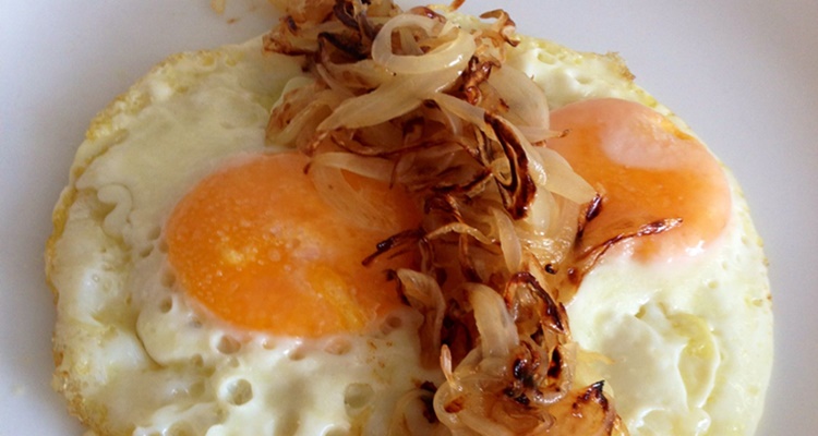4Los apetitosos huevos fritos con cebolla caramelizada
