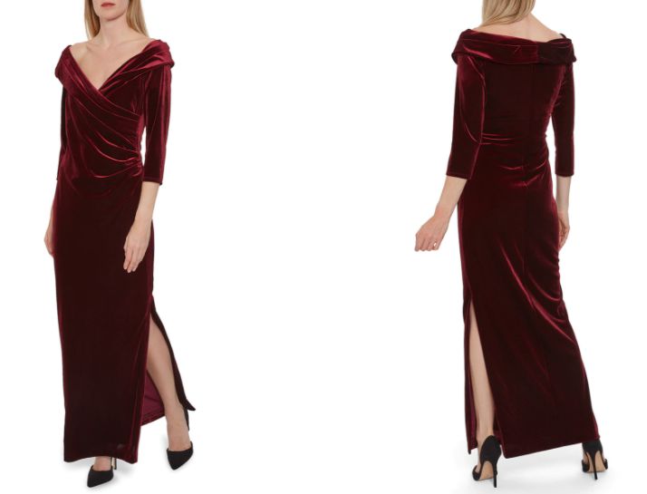 El terciopelo ha vuelto para quedarse. Lo intuíamos en primavera con esos diseños de chaquetas de terciopelo o simulando el terciopelo. La marca de alta costura Gina Bacconi lo demuestra con este espectacular vestido largo en terciopelo con un color vino divino y que realza cualquier tipo de piel. En vez de montar una manga larga, el vestido tiene mangas de 3/4 de inspiración francesa. Su sofisticado cuello de corte en V cubre perfectamente el escote y el fruncido que presenta a un lado crea un modelo de vestido de fiesta elegante, glamuroso. Está totalmente forrado y tiene una cremallera lateral oculta. Consíguelo en exclusiva en El Corte Inglés Online por tan solo 199 euros.