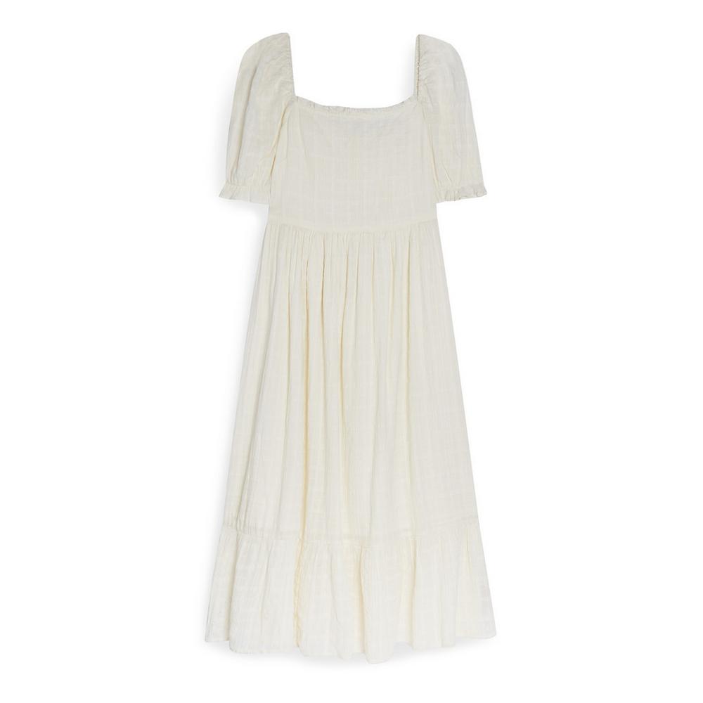 Te mostraremos dos modelos, el primero es este tan similar al primero que te hemos mostrado de H&M. Es un vestido midi con textura, escote cuadrado y manga larga. Sin duda, un diseño al que vas a atener que buscarle complementos para que pueda destacar, ya que es muy sencillo. Como era de esperar, su precio es muy económico, solo cuesta 22 euros, y lo puedes encontrar en este enlace.