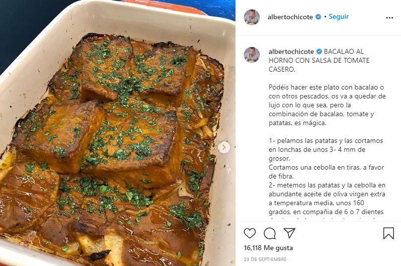 No olvidemos que Chicote comparte numerosos platos en su perfil de Instagram, siempre buscando los mejores y más saludables productos. En este caso nos muestra el bacalao con tomate al horno, pero nos recuerda que se puede hacer con cualquier pescado, ya que la combinación con las patatas y el tomate «es mágica», como él señala.