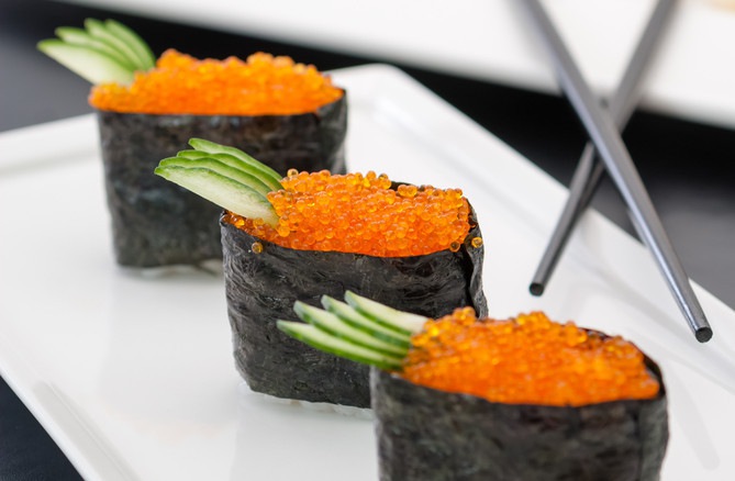 Otro de los sushis rodeados por alga nori es el Gunkan, que en realidad es una especie de maki con topping. Tiene forma ovalada y por eso le llaman el buque acorazado o buque de guerra. Forman una especie de cestita y por ello les sienta bien cualquier ingrediente que se asienta mejor que en los maki por ejemplo. Los hay con infinidad de ingredientes pero el más clásico es el que lleva huevas naranjas de salmón de pez tobiko (pez volador).