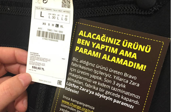 En la tienda de Zara de Estambul se pudo ver un mensaje que decía textualmente esa frase, algo que fue dicho por los trabajadores que habían hecho la fábrica. Esto se debió a que los trabajadores de la fábrica Bravo Tekstil no habían recibido un sueldo, ya que el propietario se fugó con el dinero. Por ello, los trabajadores decidieron vengarse de esta forma.