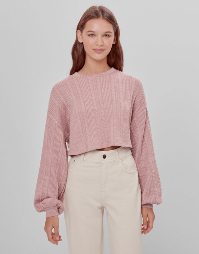 Confeccionada en poliéster y elastano, es una prenda de punto con cuello redondo con mangas abullonadas. Las costuras del hombro se han cosido caídas para aumentar el efecto oversize. El resultado es una prenda que no pasa desapercibida. Y como tiene un color rosa empolvado, no resulta difícil de combinar.