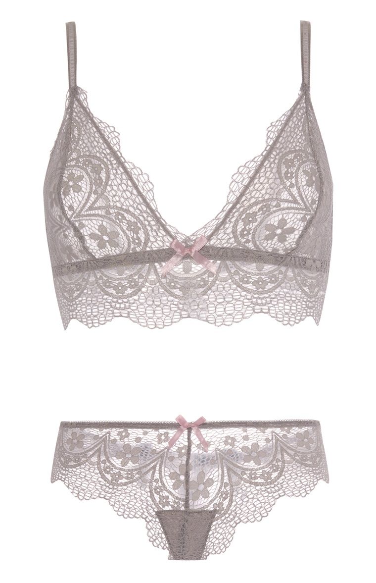 Terminamos esta lista con otro conjunto en color gris que te encantará. Se compone de un bralette de encaje con extensión de tela bajo el pecho, y un tanga a juego con el mismo encaje y pequeño lazo rosa. Un conjunto de Primark con el que te sentirás de maravilla, tanto si vas a disfrutar de una noche con tu pareja, como si vas a trabajar.