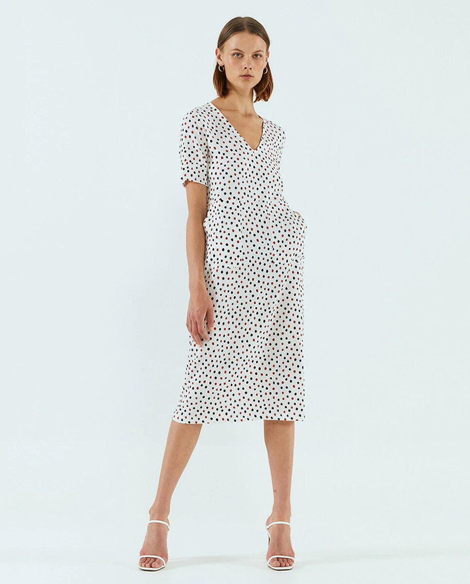 Este vestido tiene cuello de pico y dos bolsillos ocultos en los laterales. Las mangas cortas tienen dos pequeñas aperturas y es un diseño realmente fácil de combinar, tanto para un día informal como para uno formal. Este es el enlace que te llevará directa al espectacular diseño de Sfera.