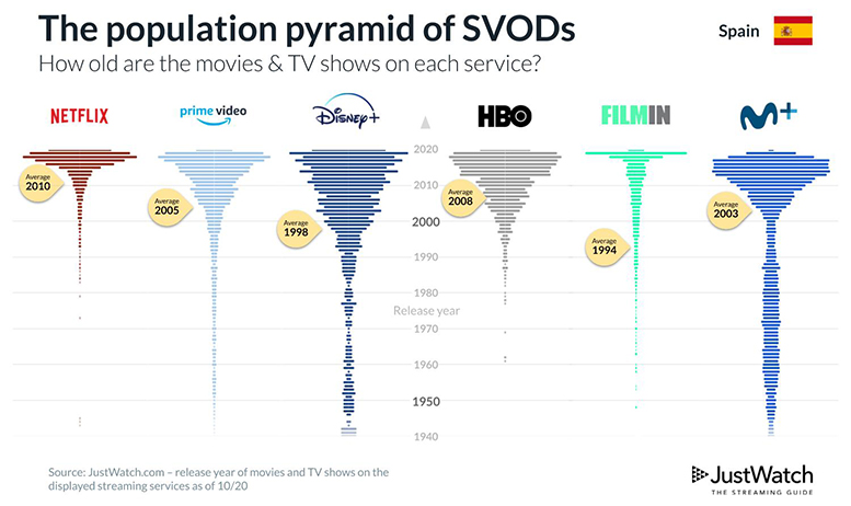 La contraposición de esta idea de tener los estrenos más recientes la muestra Disney+, que es la segunda plataforma (de las que aparecen en el informe) con los estrenos más antiguos. La fecha media se sitúa en 1998. Lógicamente las películas animadas con más años son las que tiran dicha media hacia abajo. Aunque la plataforma de las analizadas que más hace caer los periodos de estreno es Filmin (1994). En este sentido, se trata de una apuesta de la compañía española por el cine clásico y de época que lleva explotando desde su inicio. Así, aunque en los últimos años también se ha subido al carro de tener estrenos dentro de su catálogo, su gran potencial se mantiene en el contenido añejo de calidad.