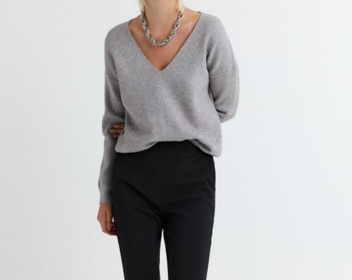 Este año se llevan los cuellos altos en sus diferentes modalidades, pero si a ti te agobian, o simplemente quieres poner un poco de variedad en tu armario, échale un vistazo a este jersey perlado con cuello de pico disponible en dos tonos diferentes, ambos muy neutros para que los puedas combinar fácilmente con otras prendas.