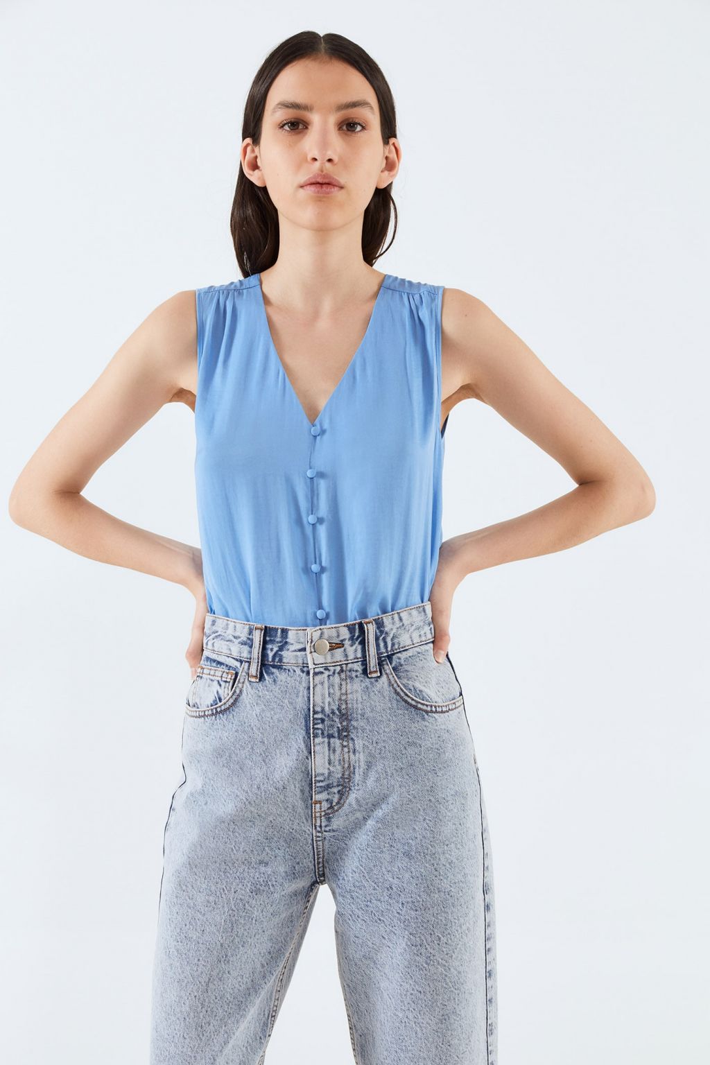 Pasamos a una prenda más sencilla de Sfera, de forma que todas puedan ver variedad entre lo que está a unos precios de lo más económicos. Este top en color azul claro tiene dos opciones más, cereza y negro, y ya que su precio es tan bajo, nada te impide elegir más de una.