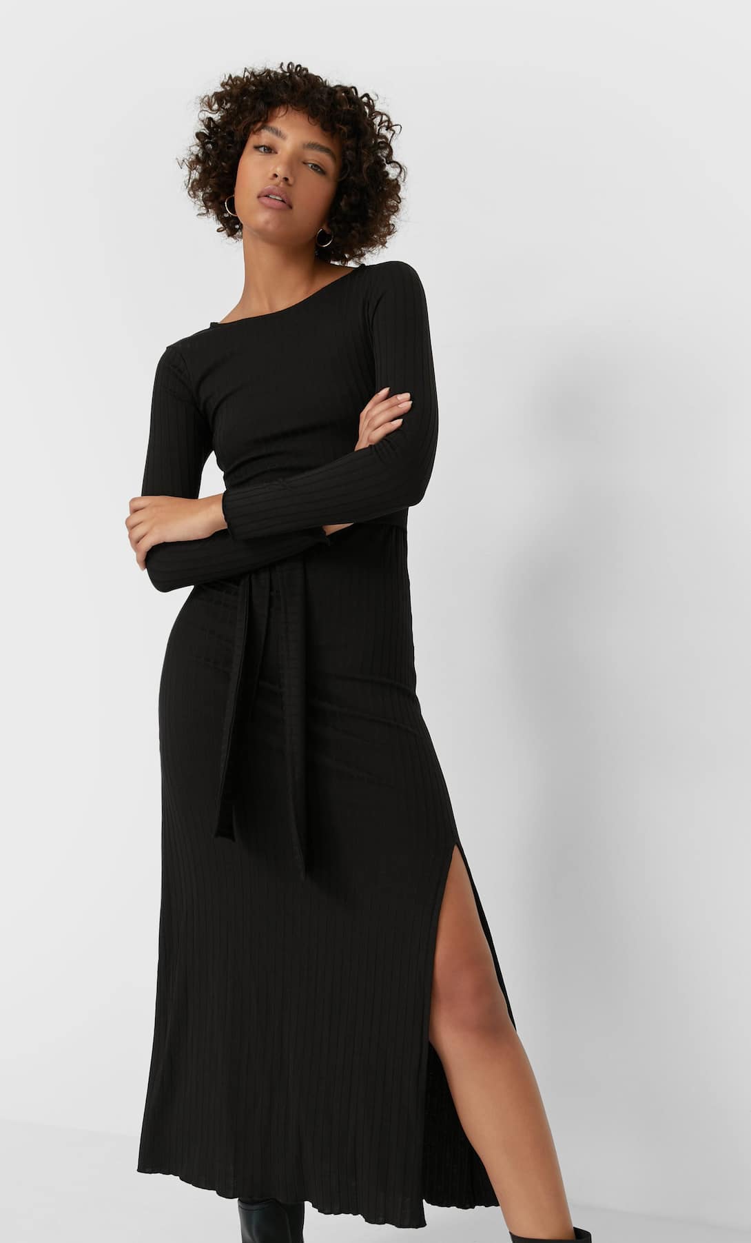 Este diseño tiene cuello redondo y manga larga. Lo mejor sin duda es el detalle de lazo en la cintura para definir mejor la figura, su abertura en espalda y la abertura en el bajo. Lo tienes disponible en negro y en camel oscuro. Este es el enlace donde puedes encontrarlo.