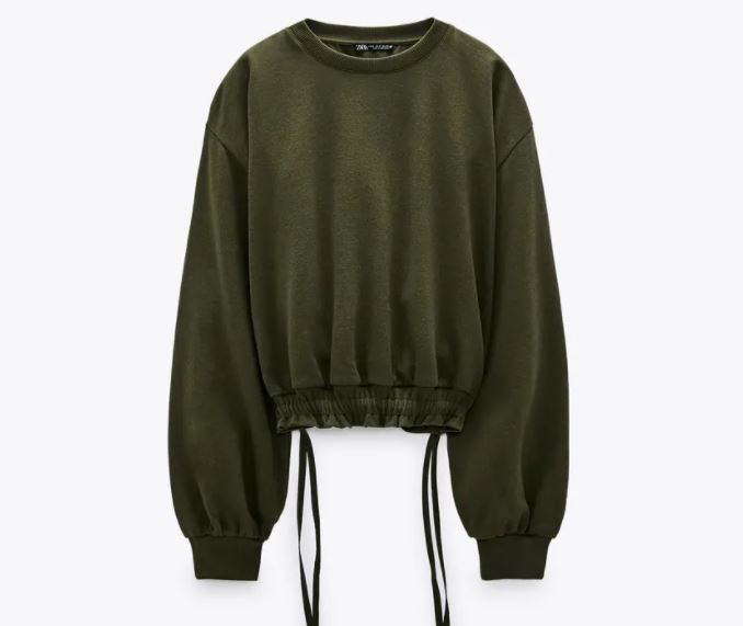 Continuamos con una de las joyas de la corona. Zara tiene la sudadera de la temporada, y es que esta prenda condensa todas las tendencias en una. Se trata de una sudadera de cuello redondo y manga larga, bastante amplia y con el bajo con frunces ajustable con cordones.