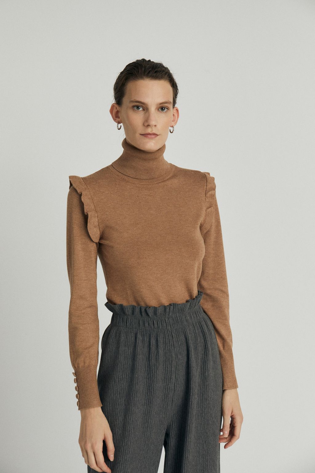 Los jerséis sencillos pero con pequeños detalles son los grandes protagonistas de este otoño, pues nos permiten crear diferentes looks con una sola prenda. Otro ejemplo nos lo encontramos en este diseño de Sfera, que destaca por sus volantes en hombros.