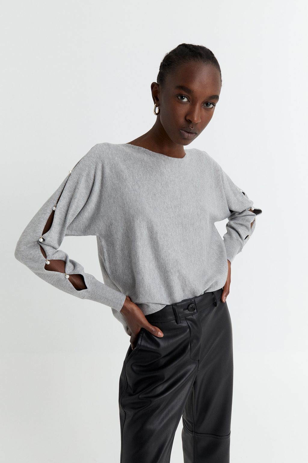 Si el cut out se sigue utilizando en vestidos para otoño, por qué no usarlo también en jerséis. En Sfera tienen este modelo con cut out en brazos con detalle de perlas.