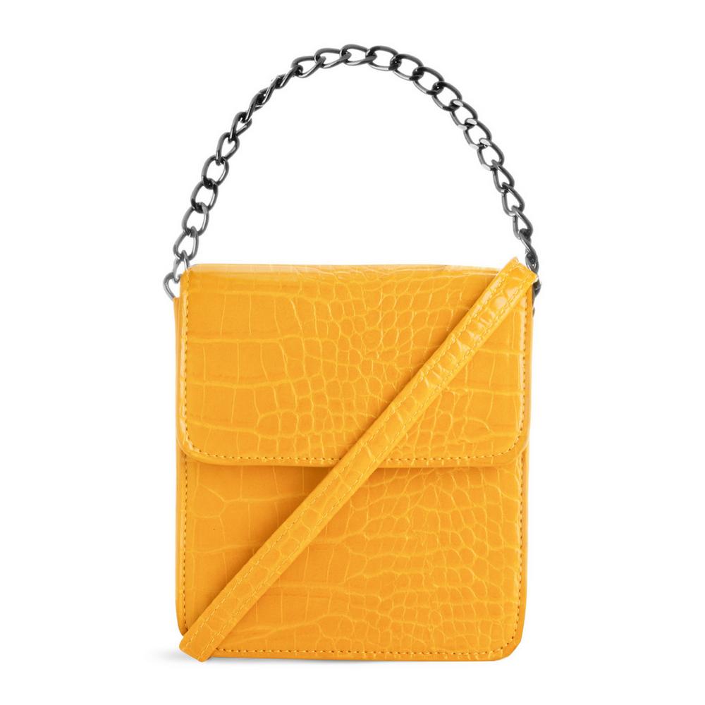 Aprende a divertirte con tu ropa y complementos para crear los diseños más originales. Ya que dejamos muy lejos la vergüenza de la adolescencia, es momento de que te hagas con un diseño de bolso como este. Cuenta con efecto cocodrilo y asa de cadena. El precio de esta maravilla de Primark es de solo 8 euros.