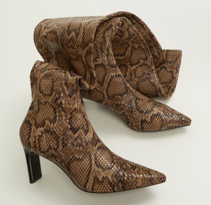 No te preocupes, para hacer estas botas de Mango no ha sido necesario que ningún animal sufra, porque es un estampado totalmente sintético. Se trata de unas botas altas con efecto piel de serpiente, acabadas en punta y con un tacón de 7 cm que es un poco ancho y por tanto te permite caminar más cómodamente.
