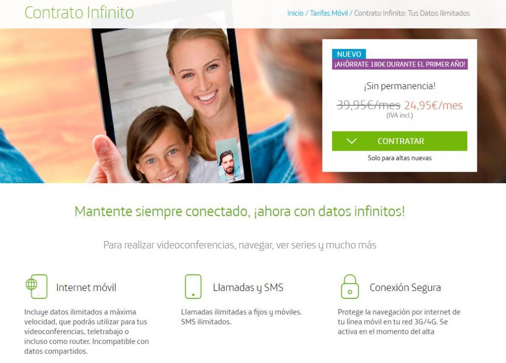 Y si lo único que te interesa es tu teléfono móvil, tu tarifa es Contrato Infinito de Movistar. Estarás siempre conectado ya que incluye datos ilimitados a máxima velocidad. Si tu teléfono es tu herramienta de trabajo, si sueles utilizarlo para hacer videoconferencias o para viajar este es tu plan. Incluye el servicio de roaming por el cual tienes las mismas condiciones de tu tarifa nacional y navega con hasta 50GB en países de la Unión Europea, Islandia, Liechtenstein, Noruega y Reino Unido. Ya en territorio nacional, tiene llamadas ilimitadas a fijos y a móviles. Su coste promocional es 29,95 euros, y después de tres meses pasa a 39,95 euros al mes. No tiene permanencia.