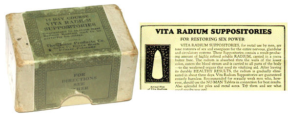 En Alemania era el Radium Chocolate (1931-1936), chocolate radiactivo, pero en Denver, Colorado, no se quedaban atrás. Una empresa de Estados Unidos llegó a comercializar supositorios con elementos peligrosos.