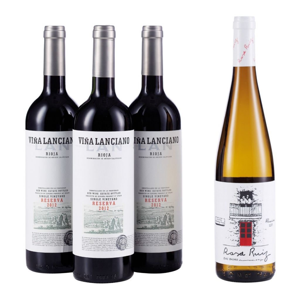 La caja incluye 4 botellas de vino. 3 botellas son de Viña Lanciano de la cosecha de 2012, y la otra es de Rosa Ruiz de 2017.