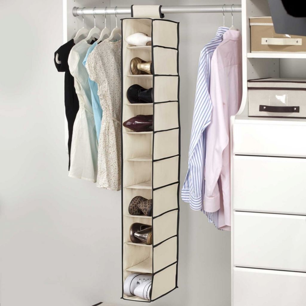 Todos hemos vistos esos plásticos que se cuelgan detrás de la puerta para los zapatos, aunque cada uno lo usa para lo que más le conviene. Pero si no te gusta tenerlo a la vista, y temes que ese plástico se ensucie con el tiempo, tienes la opción de comprar un organizador de armario como el de la foto. Estos se suelen usar para apilar camisetas dobladas cuando no hay un gran espacio, pero resulta que para el calzado tienen el tamaño perfecto, y lo mejor de todo, hay muchos estilos y colores diferentes.