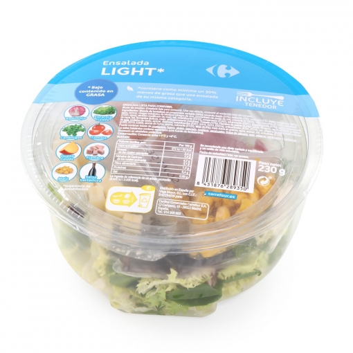 Por ello, deberías apostar a lo seguro con esta ensalada light del supermercado francés, la cual no tiene nada que envidiar a las que pueden vender en Mercadona o Lidl. Tiene tan sólo 65 calorías por cada 100 gramos, a pesar de tener todo tipo de ingredientes. El paquete tiene 230 gramos y cuesta un poco menos de 3 euros por unidad.
