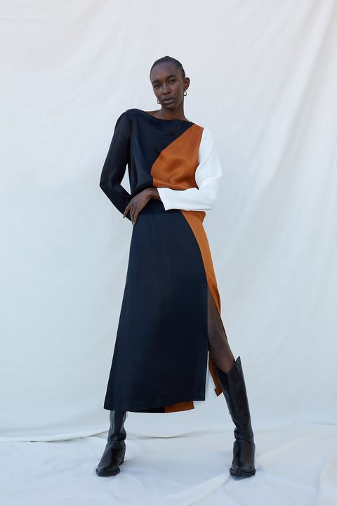 Si a veces combinar prendas de un solo color ya es complicado, la cosa se vuelve todavía más difícil cuando en una misma pieza de ropa ponemos tres colores. En Sfera lo han solucionado fácilmente ofreciéndonos un conjunto de falda y jersey con un original diseño en tres colores. Si los luces juntos consigues un efecto vestido elegante y original.