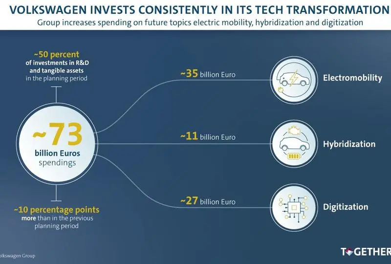El grupo automovilístico Volkswagen invertirá alrededor de 73.000 millones de euros en electrificación, sistemas de propulsión híbridos y tecnología digital durante los próximos cinco años para continuar con su transformación hacia una empresa de movilidad digital.