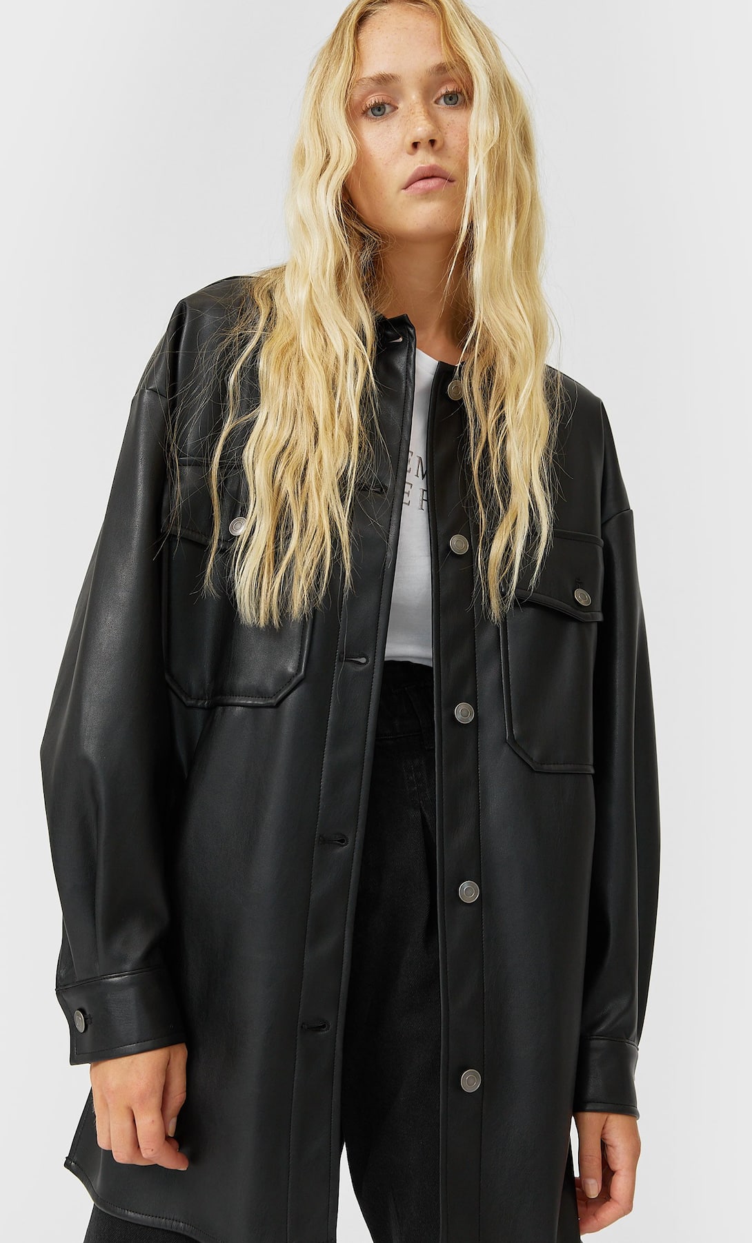 Pasamos a una prenda bastante menos habitual usando el efecto piel. Una sobrecamisa con la que puedes jugar a crear el look que más te guste, aunque tiene ese aspecto agresivo que ofrece el efecto piel en color negro.