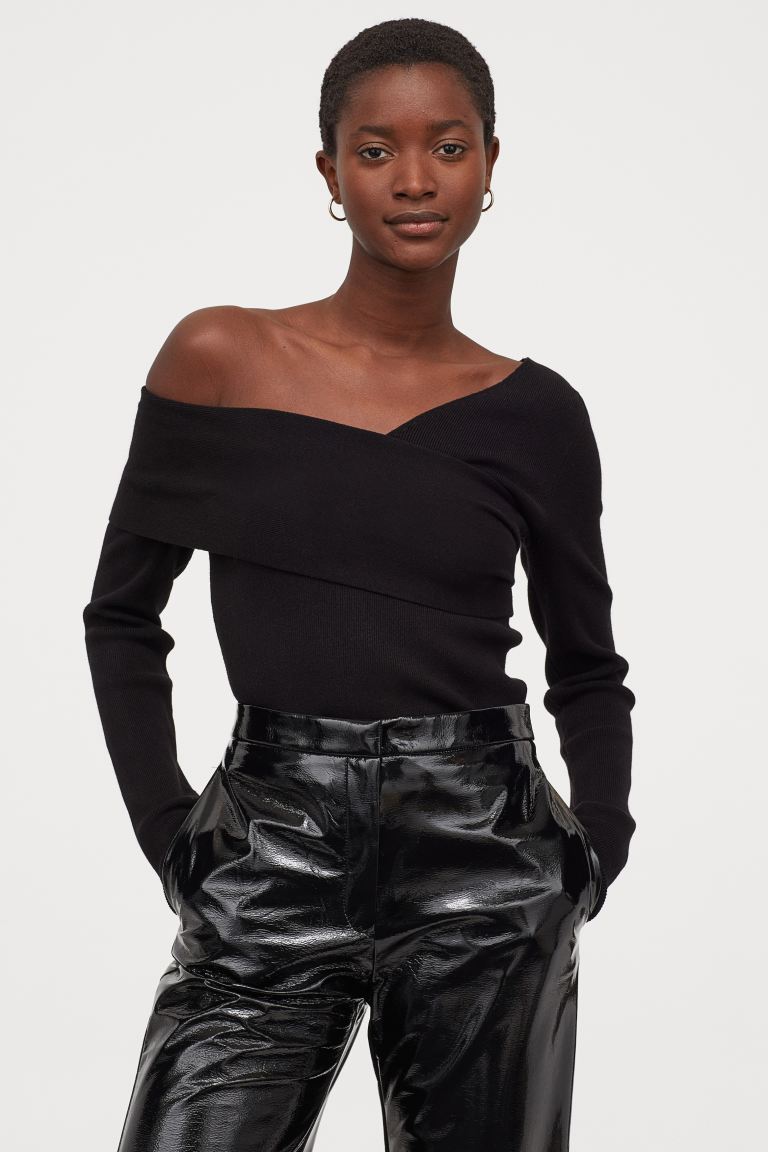 Se trata de un top de punto fino de viscosa, tela muy similar a la seda. El diseño tiene una manga larga junto con una sección ancha plegable para el escote, lo que deja un hombro descubierto.