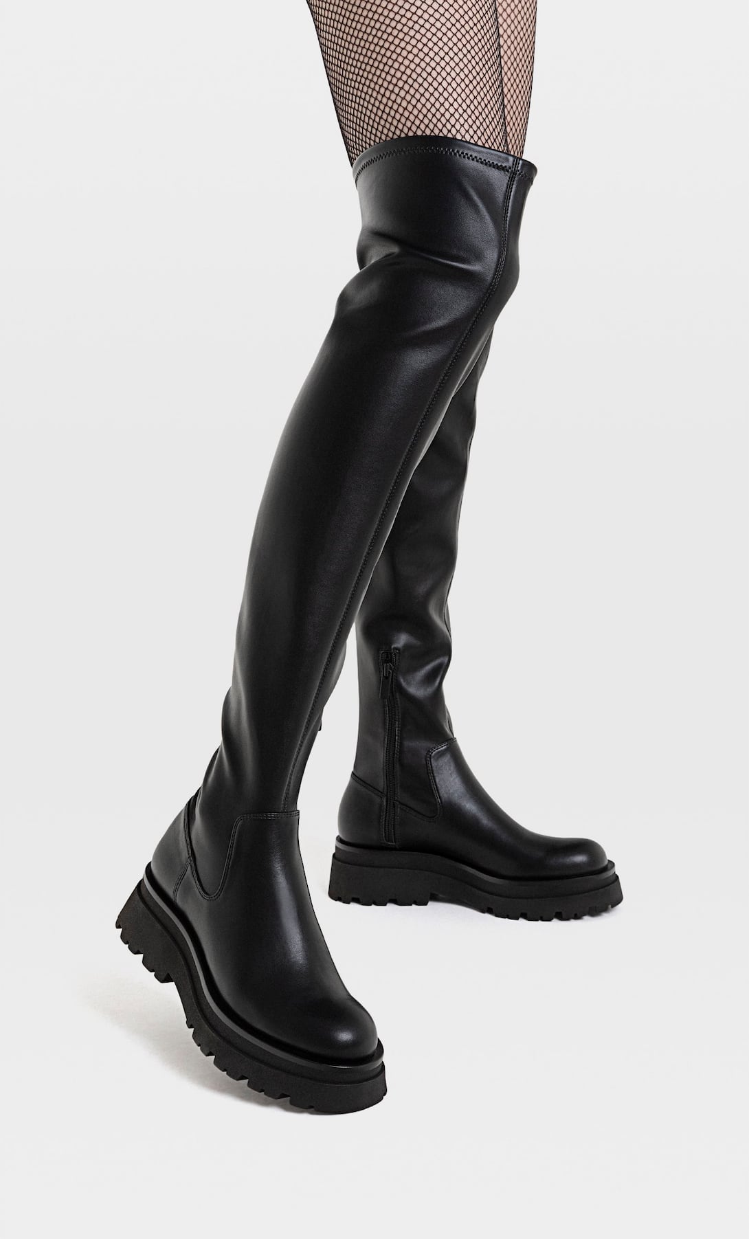 Estas botas cuentan con una leve plataforma de piso track, y son de color negro. Son altas sí, pero llegando por encima de la rodilla. Así que si tus piernas no son muy largas, te recomendamos usar este calzado con unos pantalones skinny en lugar de una falda corta. De lo contrario, te verías mucho más bajita de lo que posiblemente ya eres. El precio de estas botas es de 49,99 euros, y las puedes encontrar entrando en este enlace.