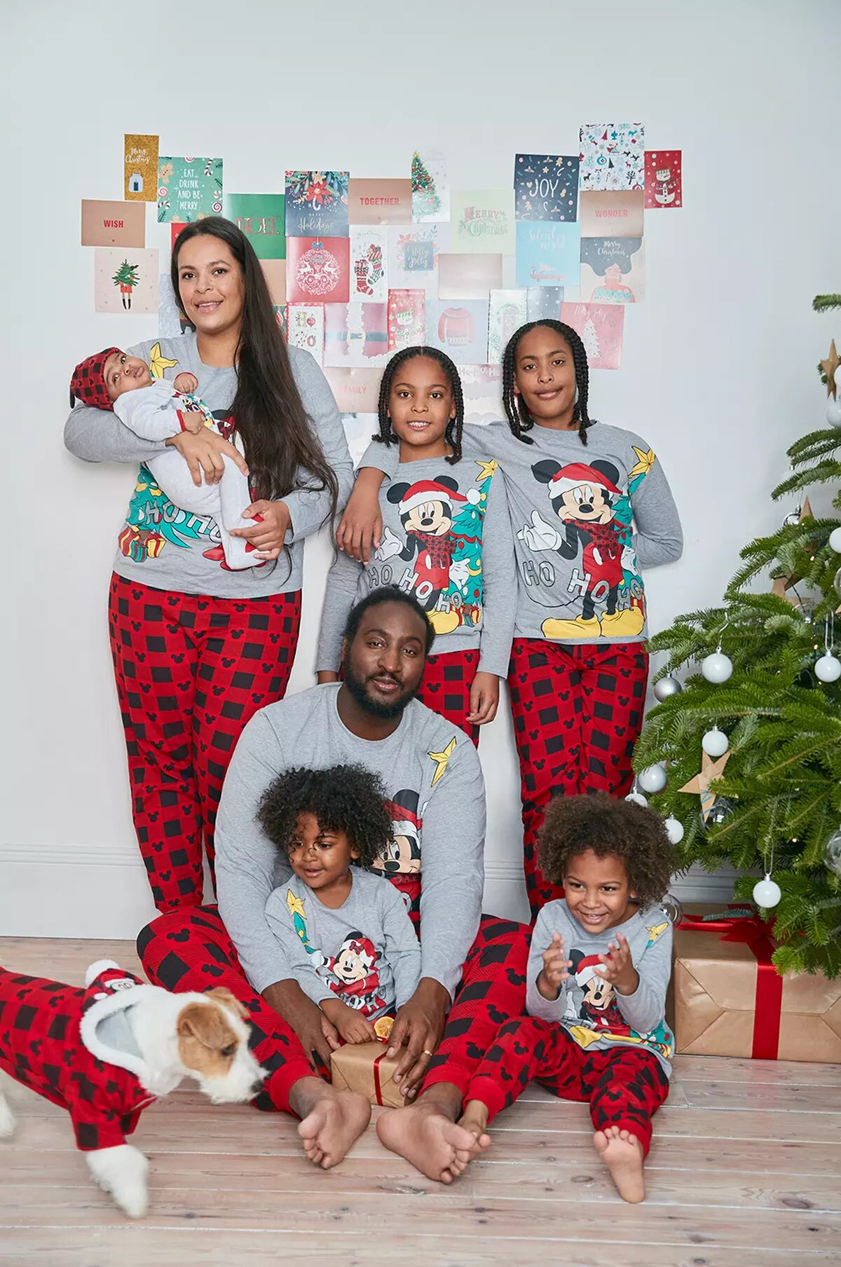 Su camiseta es de color gris, y tiene a Mickey Mouse vestido de Papá Noel con un árbol de Navidad de fondo con los pies llenos de regalos. En cambio, el pantalón es de color rojo y negro con estampado de cuadros y pequeñas siluetas de la cabeza del personaje. El precio del pijama para adultos es de 15 euros, para los niños es de 12 euros. Para los bebés tiene un precio de 10 euros, y para las mascotas de 12 euros.