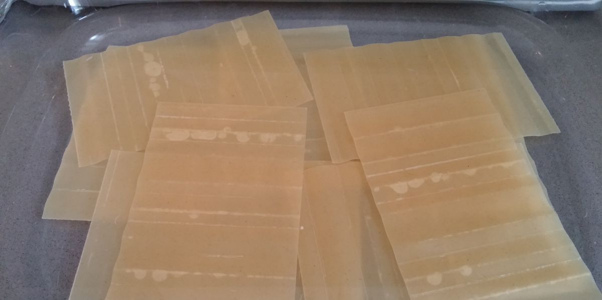 Cuando hayan pasado unos 7 minutos, retira las obleas, deberían estar al dente, y puede que incluso aún algo duras, pero las terminaremos más adelante. Ahora, déjalas sobre papel absorbente y sigamos con la receta.
