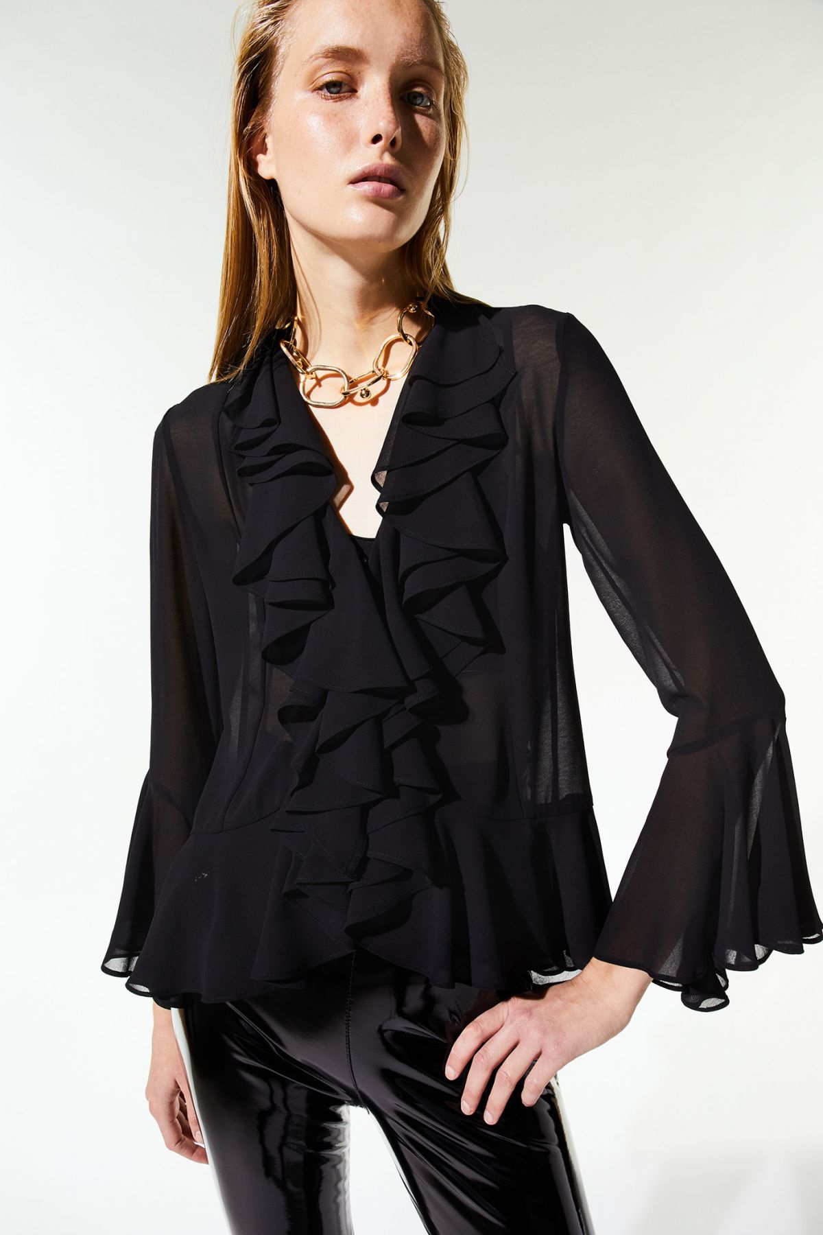 Esta camisa de la firma es de tejido semitransparente, por lo que debes elegir con cuidado qué es lo que vas a llevar. Lo mejor es el volante que tiene rodeando el cuello, en los puños y bajo de la camisa. Este es el enlace donde podrás encontrar la camisa, la cual está disponible en color negro.