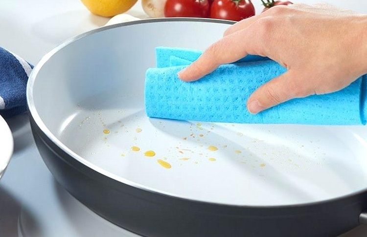 La mejor opción es usar un estropajo con púas de silicona. No solo no raya la superficie de la sartén, sino que raspa lo suficientemente bien como para sacar la suciedad fácilmente y se puede limpiar y desinfectar fácilmente después de cada uso, por lo que es mucho más seguro para tu salud.