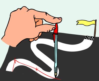 Sobre el papel en blanco, debemos dibujar un circuito, indicando la salida y el final. Cuida que tenga curvas grandes y también tramos rectos, jugando con sus formas (anchos, estrechos…).
