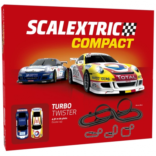 En este pack se incluyen las piezas para construir el circuito (admite variaciones), y dos coches listos para competir.