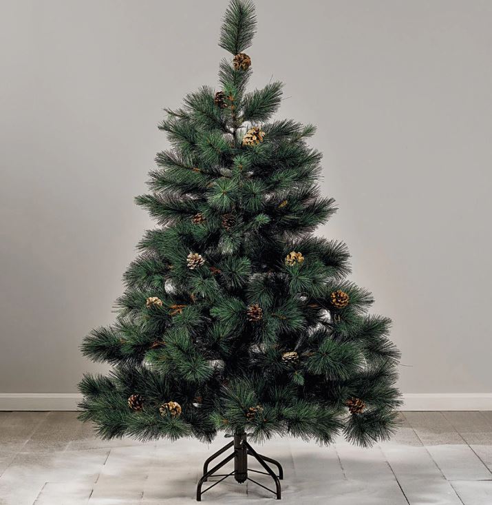 El primer adorno es este Árbol de Navidad Sestriere con piñas decorativas. Está pensado para ofrecer un estilo realista y natural, diseñado con líneas clásicas. El producto está hecho de polietileno para que dure mucho y no se rompa. Además, permite colocar todo tipo de adornos como los que veremos después.
