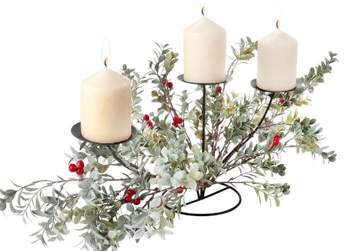 Finalmente, tenemos este centro de mesa con 3 soportes berry de color verde. Se trata de un centro de mesa perfecto para colocar velas, estando decorado con hojas verdes, hojas grises y bayas de color rojo. También destaca su material de PVC y sus 60 centímetros de largo.