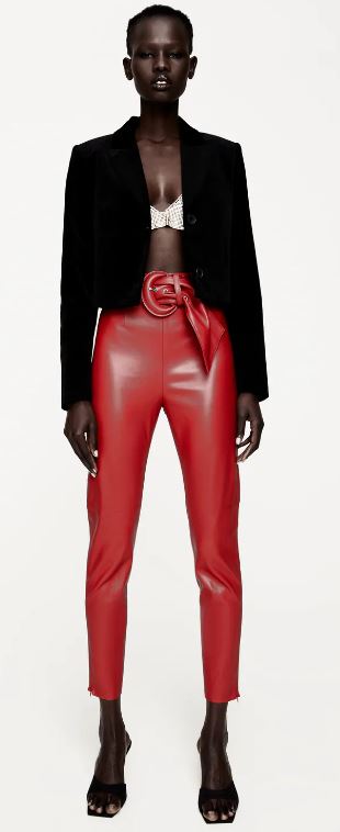 Ahora veremos este legging con cinturón incorporado. Estamos ante una prenda con efecto piel, tiro alto y un cinturón combinado con el mismo tono de rojo que el pantalón. Asimismo, tenemos un bajo acabado con cremallera y un cierre lateral con la cremallera oculta en la costura del pantalón.