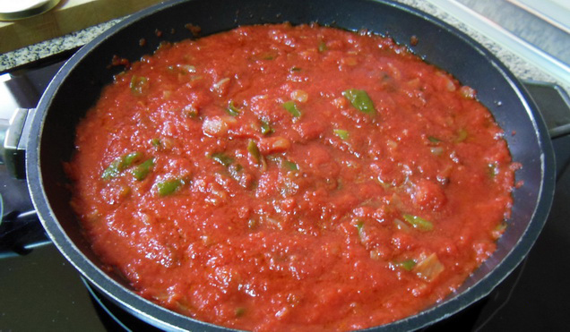 El primer paso es picar la cebolla y el pimiento en trozos pequeño y preparar un sofrito con ellos, en una sartén con un poco de aceite de oliva, y los dientes de ajo picados. Los dejamos dorándose a fuego lento durante unos 20 minutos, y mientras, lavamos y troceamos los tomates. Los incorporamos a la sartén y dejamos que se frían junto con el sofrito del pimiento y la cebolla. Al soltar los tomates toda el agua, la salsa comenzará a salpicar, así que podemos bajar el fuego y remover cada poco para que la salsa no se pegue al fondo. Se tiene que cocinar hasta que el agua se evapore y la fritá vaya quedando bien espesa. Al enfriarse, continuará espesando un poco más.