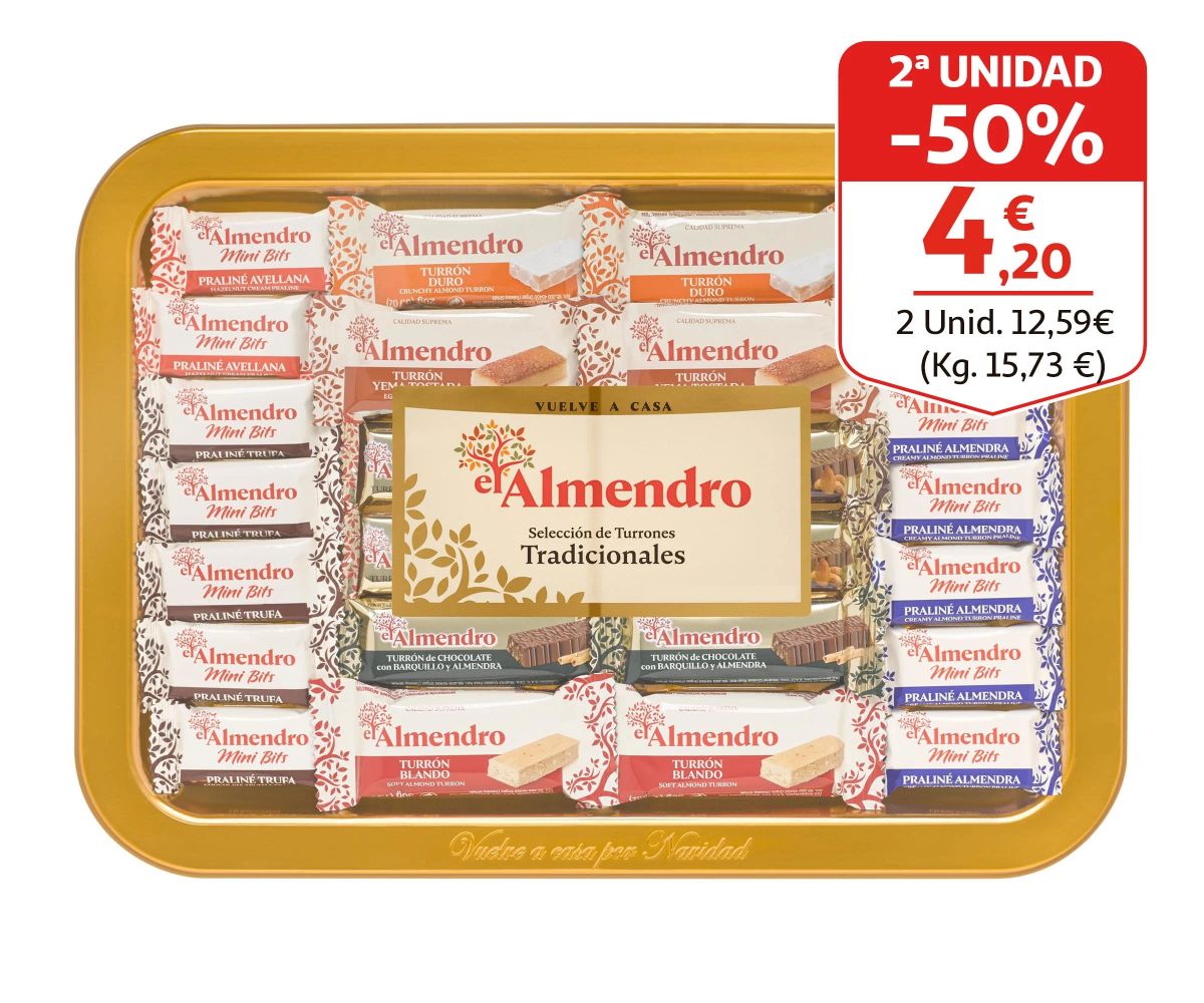 Podrás adquirir este surtido especial de turrones en porciones de la marca El Almendro por 7.98€ la bandeja de 400 gramos. Todo gracias a la oferta actual y que también incluye una promoción del -50% en la segunda unidad.