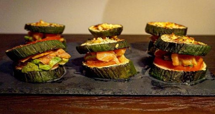 Algunos chefs optan por maniobras un tanto más complejas, pero algunas recetas son de una gran sencillez como este. Aquí se puede utilizar el calabacín a modo de pan de una hamburguesa, que va rellena principalmente de salmón, tomate y boniato, quien también ayuda a adelgazar. Puedes esparcir sobre él un poco de pimienta cayena, limón y hierbas. ¿Quién ha dicho que las dietas tienen que ser aburridas?