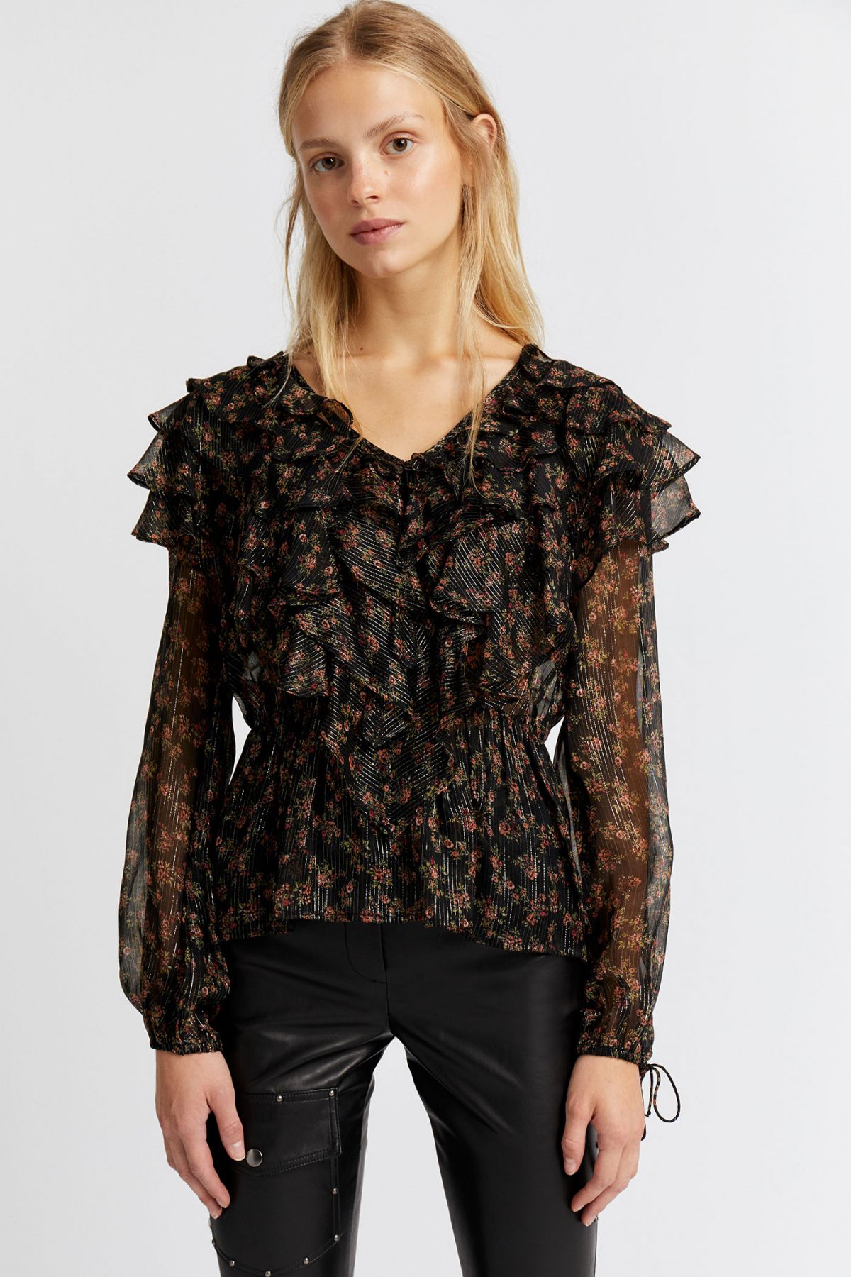 Esta es sin duda una prenda espectacular para eventos más importantes. Se trata de un modelo de transparencias con manga larga y detalle de volantes en la parte frontal superior y elástico en la cintura.