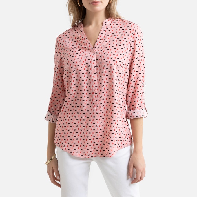 Entre nuestras propuestas queremos incluir la blusa vaporosa con cuello tunecino pronunciado y pieza de abotonado. Con su precioso escote de pico, tiene un estampado gráfico muy alegre.