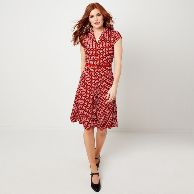 Otro vestido que te gustará es este, que cuenta con cinturón y motivos además de cuello camisero abotonado en rojo estampado Joe Browns. Se trata de un vestido evasé estilo patinadora en manga corta con cuello de polo y camisero.
