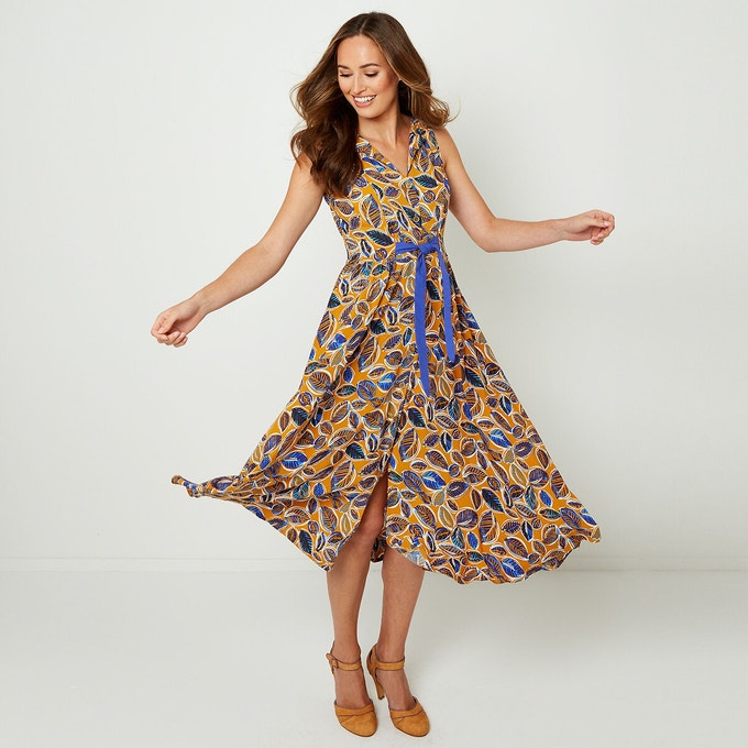 Un bonito vestido vaporoso en forma evasé y estilo patinadora con motivo de vegetaciones y un precioso lacito en la cintura en color amarillo y azul de Joe Browns.