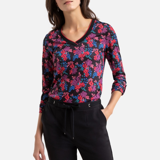 Ideal para aquellos que quieren camisetas con cuello de pico. Esta camiseta con tejido 100% poliéster tiene un motivo de flores muy bonito. Camiseta con estampado floral y fondo negro Anne Weyburn.