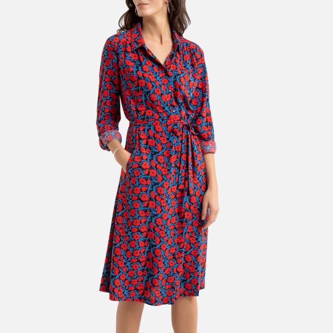 Este vestido largo evasé es un vestido camisero largo con estampado floral en fondo negro Anne Weyburn, una prenda que gusta a muchas mujeres y queda fenomenal en las ocasiones más especiales.