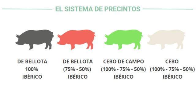 Hay quien piensa que solo los cerdos con genes ibéricos al 100% y que se hayan criado en la dehesa alimentándose con bellotas, pueden llevar el distintivo ibérico. Pero la realidad es que esta denominación incluye a más variedades. Por ejemplo los cerdos que solo tienen un 50% de genética ibérica y que están alimentados con piensos. Evidentemente estos últimos jamones ibéricos serán más económicos que los primeros. Para tener claro lo que se está comprando es importante aprender a leer los precintos, que además están establecidos por el Gobierno. Se dividen en varios colores y se indica la carga genética de cerdo en porcentaje: 100%, 75% o 50%. Por otra parte también se debe reflejar el tipo de alimentación que suele ser de tres tipos: bellota, cebo de campo o cebo (a secas). La diferencia entre estos dos últimos es que el cebo de campo incluye hierbas, pasto natural y pienso. Los que comen cebo significa que solamente se les da pienso.