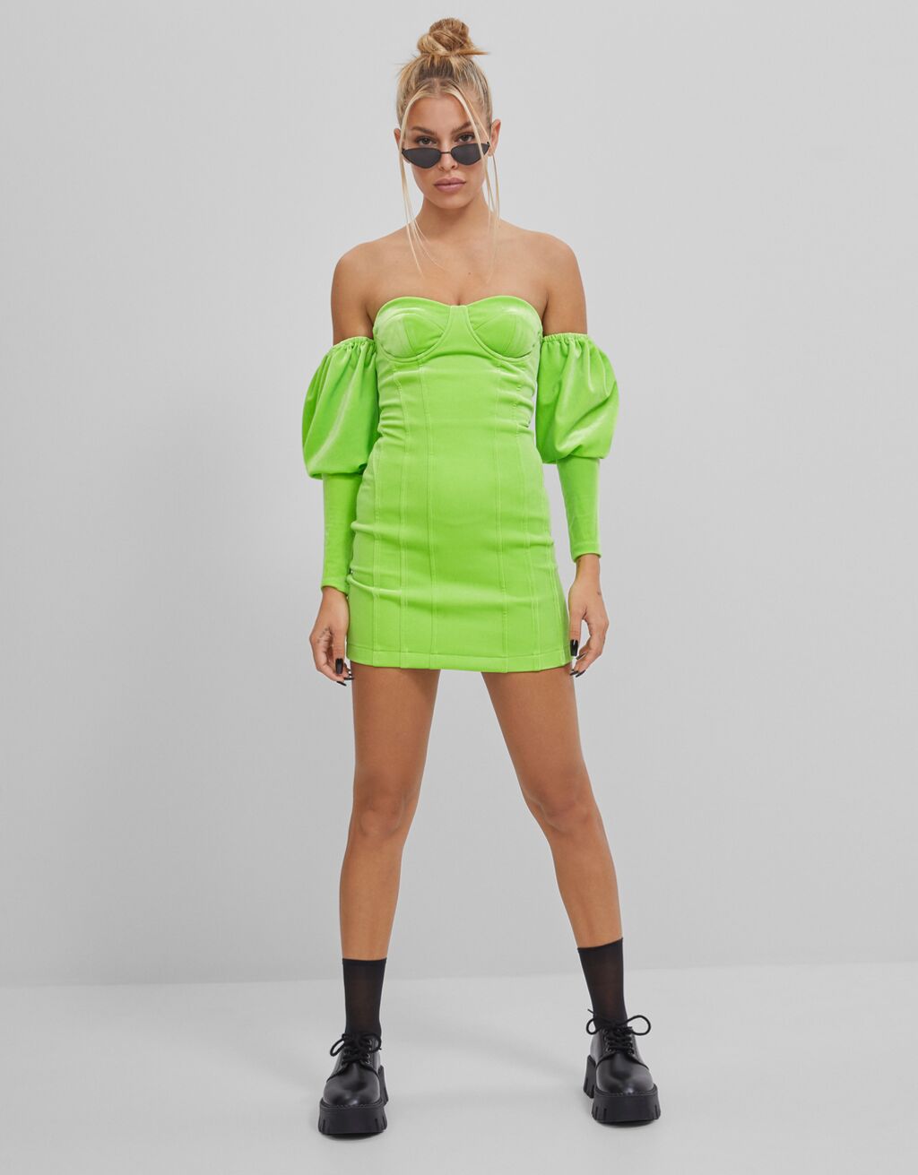 Y es que no todos los días se ve un vestido de color lima con el que salir de fiesta. Pero no solo llama la atención el color, también su diseño. El corsé, las mangas abullonadas, todo es espectacular.